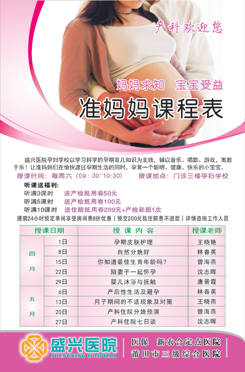 我院“孕婦學(xué)校”每周六上午開課,聽課人數(shù)30人以上,已有近萬名孕婦受益。為答謝廣大孕婦對醫(yī)院支持與信任,推出各項優(yōu)惠政策:
